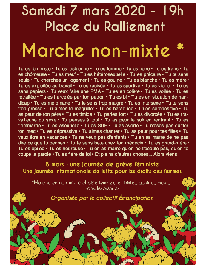 Conformément au communiqué de l’intersyndicale nationale d’avoir des initiatives autour du 8 mars, journée internationale des droits des femmes, l’intersyndicale départementale appelle les salariés à arrêter le travail à 15h30 le jeudi 5 mars 2020, à déposer leur cahier revendicatif à leur direction et à se rassembler à 17H00 place du ralliement.