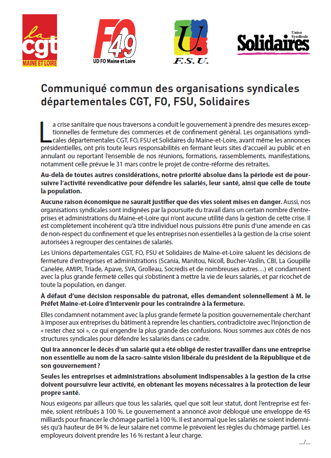 Communiqué commun des organisations syndicales départementales du Maine et Loire CGT, FO, FSU, Solidaires