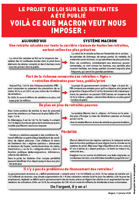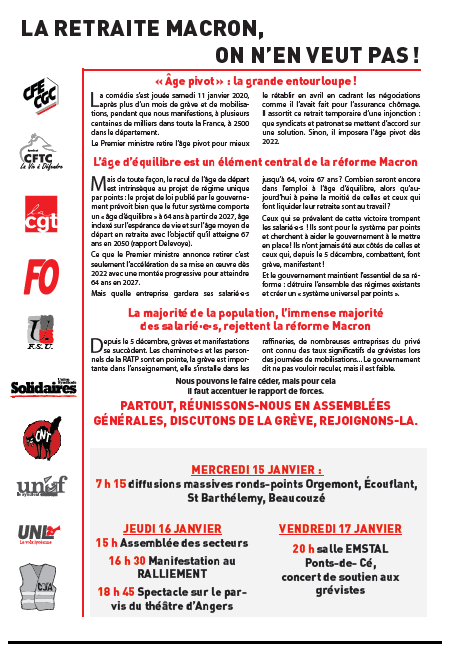 Les centaines de milliers de grévistes et de manifestant-es depuis le 5 décembre ne se laisseront pas abuser. Les journées des 14, 15 et 16 janvier proposées par l’intersyndicale seront l’occasion de le montrer et de renforcer encore la grève reconductible et les manifestations pour le retrait.
