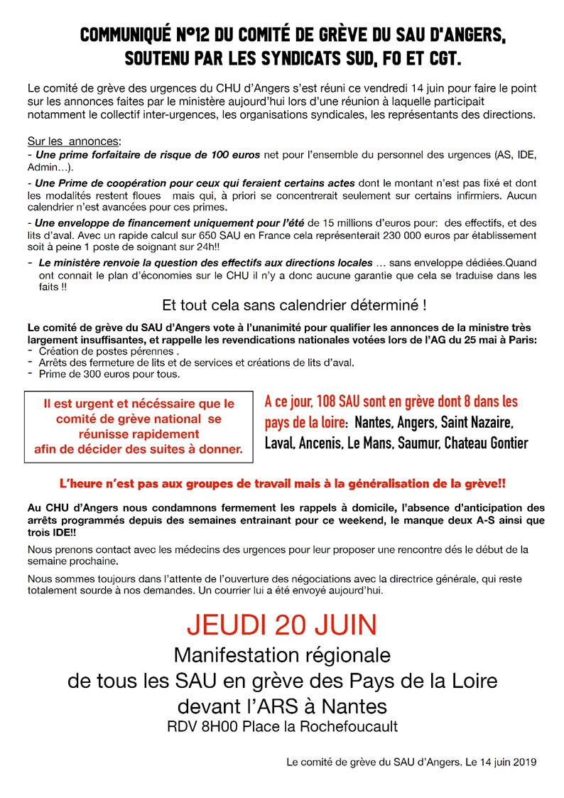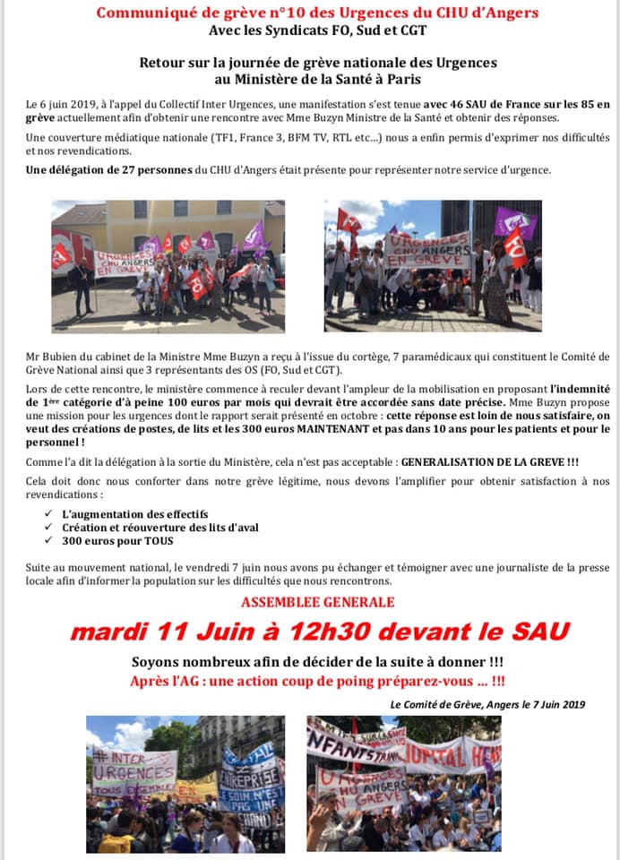 Communiqué de presse des syndicats SUD, FO, CGT du CHU d’Angers . Urgences du CHU d’Angers en grève depuis le 2 mai,